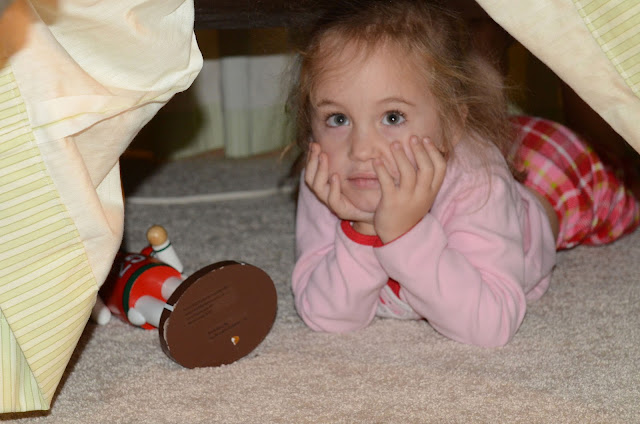 When we were packing up to leave we couldn't find Cohen anywhere. At first it wasn't a big deal but when she wasn't in Uncle Davis' room we started to wonder. Pop quickly looked under Nana's bed and decided to play along with her since she was under there hiding! She loves to hide and scare someone! He did start giving us hints so I got my camera ready. Kelly lifted the bed skirt and I snapped hoping it would work...it did! This is exactly how she looked, waiting to be found! Nutcracker and all!