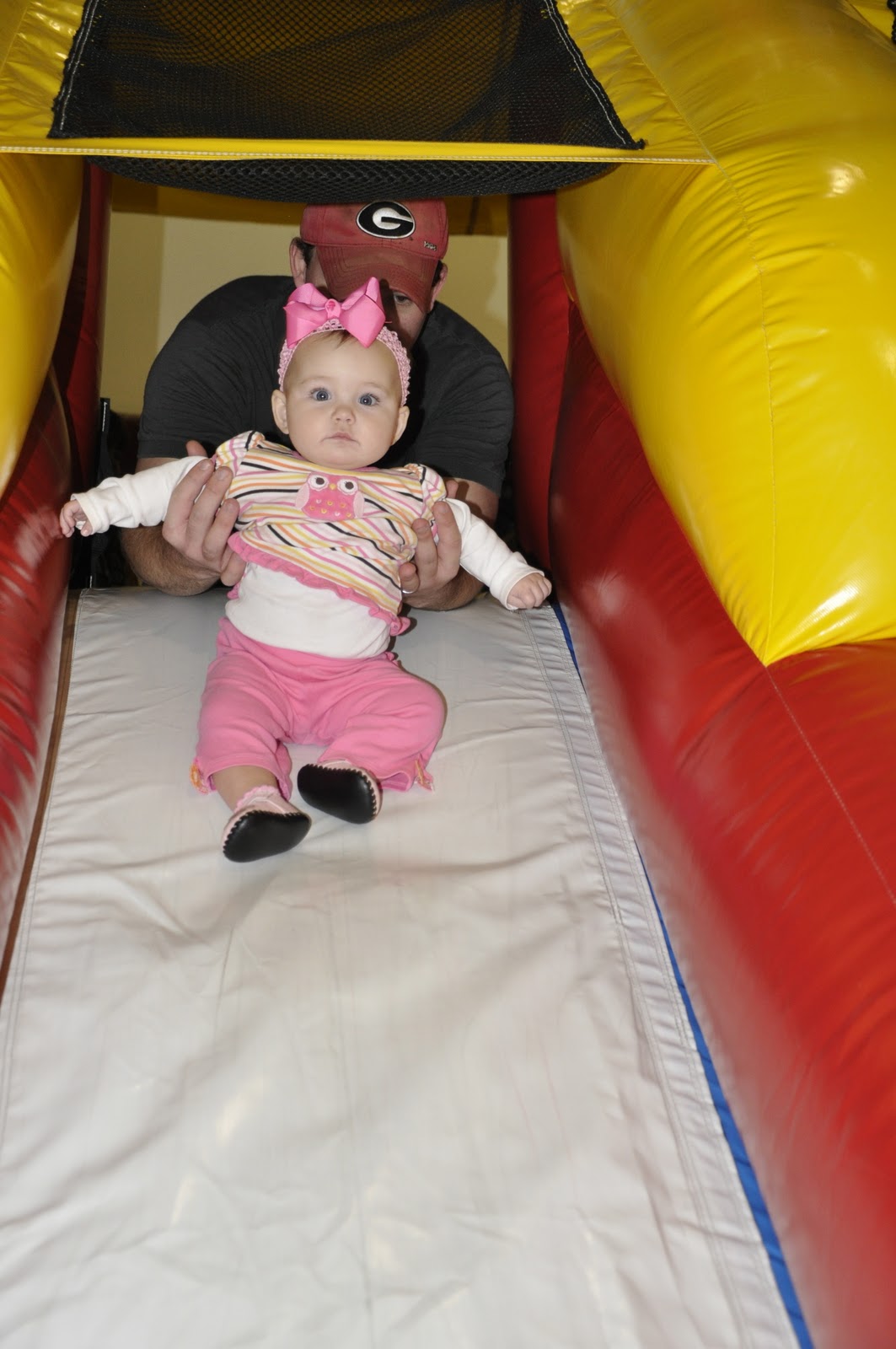 If your around our family, you may have heard me mention how nosy our little Kate is. This baby has to see everything thats going on whether its someone in the house, Cohen playing with toys, the T.V., you name it and she has to see whats going on with it. Tonight Cohen was sitting at our kitchen counter playing her LeapPad, or "Lily Frog" as she calls it. I was walking by with Kate and when we got to Cohen Kate almost leaned out of my arms to see what Cohen was doing. It was funny that I asked Kelly to take a picture. She would lean back up and as soon as Cohen's game would make another sound she would fall back over trying to get a glimpse over Cohen's shoulder. She is definitely my little "nosetta".