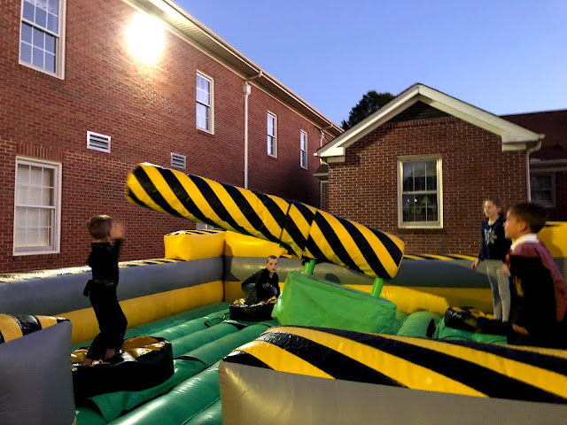 Sunday night we finished off a fun Halloween weekend with our fall festival at church. This is always so much fun and this year was no different. Cohen was dead set on winning in the cake walk, and she did! She ended up with Suzy's bread and she was thrilled. Bryce enjoyed the inflatables! He stayed on the big slide for probably an hour then headed to the obstacle course. That is also where Kate spent a lot of her time. They all had a ball! They were having so much fun that they forgot to do the hayride so when the festival was over they caught a ride on the trailer back to Jeremy and Stacey's house. It may have been a different route but they got a hayride in! They also racked up on more candy at trunk-or-treat. I think we may have sugar highs for the next 2 months.